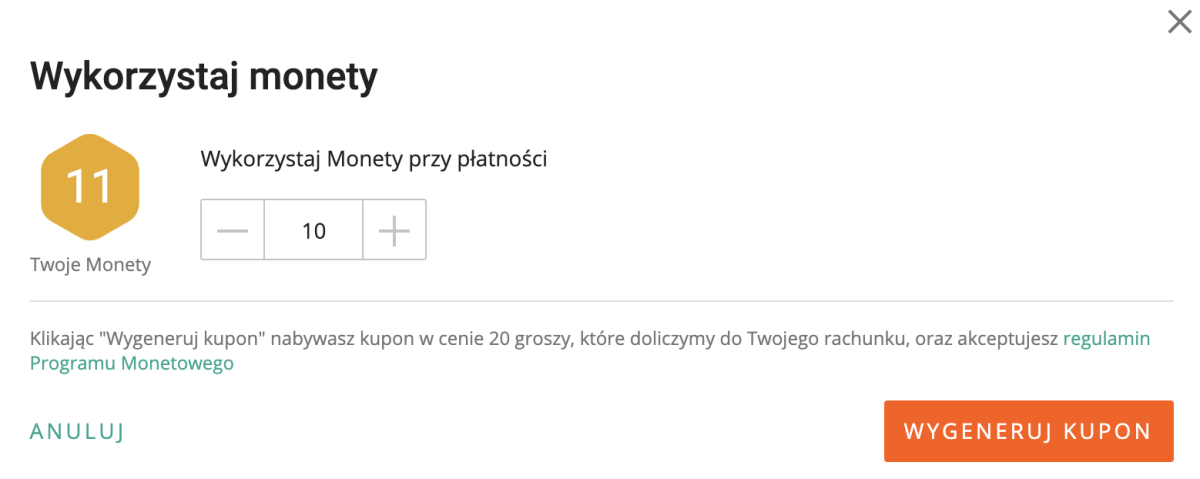 - W kolejnym kroku określ liczbę Monet, jaką chcesz wykorzystać podczas transakcji i kliknij [Wygeneruj kupon]
